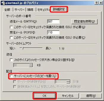 | 11 | 引き続き「詳細設定」タブをクリックし、「送信メールポート番号」の変更、「サーバーにメッセージのコピーを置く」のチェックをはずし、「OK」ボタンをクリックします。![]() 【送信メール(SMTP)ポート番号】 25 ⇒ 587 へ変更 【サーバーにメッセージのコピーを置く】 チェックをはずす | |
